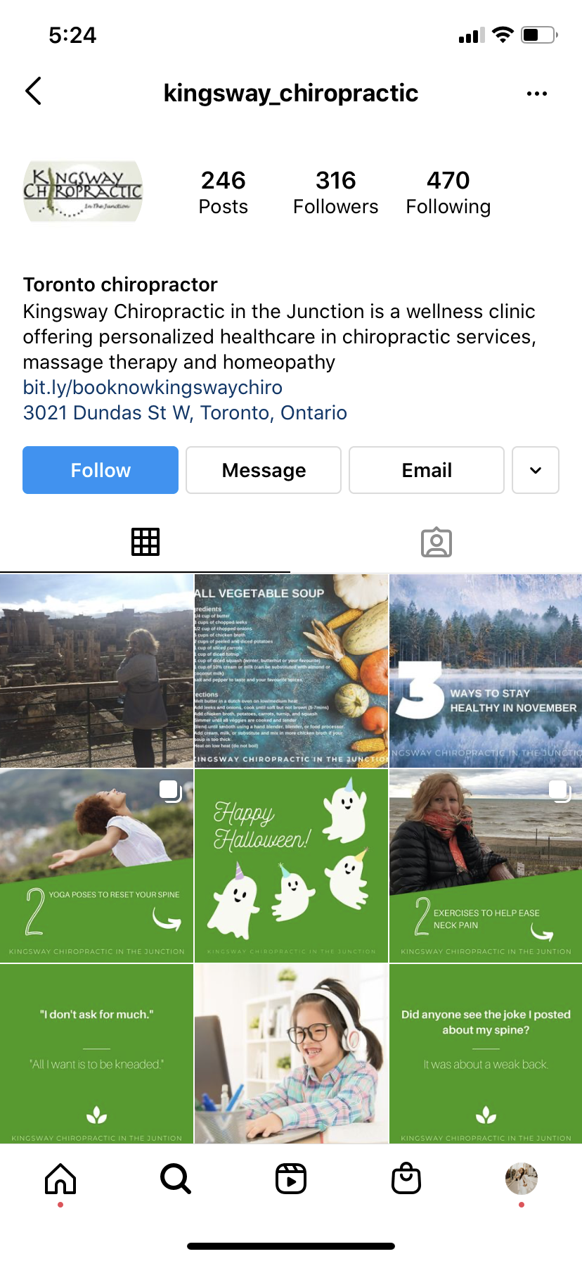 I’d get on a schedule where you don’t use this super regularly but like once a week maybe post up a fun chiropractic fact or joke (Shows you’re relatable), a neat article about something new in the chiropractic community (shows you’re current and up to date), and then maybe something for any major holiday or Toronto event that comes up - you know, just to keep ya relevant. You honestly don’t have to put too much time in to twitter as it’s less about regular engagement and content than the others… also, the demographic is kinda older and the appeal is kinda dying out - still worth having though.